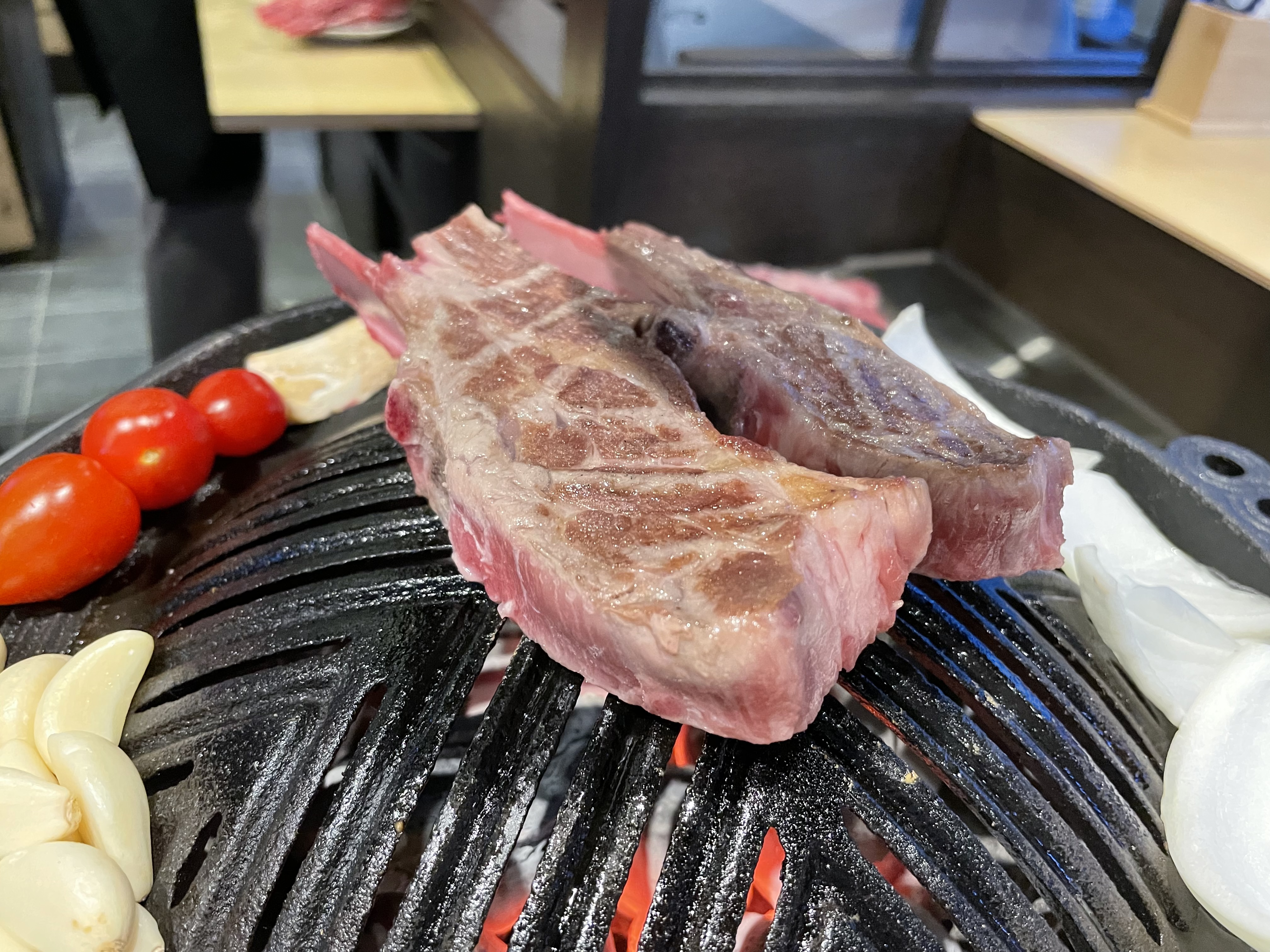 주문하면 화로를 자리 앞으로 가져와서 바로 앞에서 맨투맨으로 고기와 곁들여진 야채를 구워주기 시작하시는데,