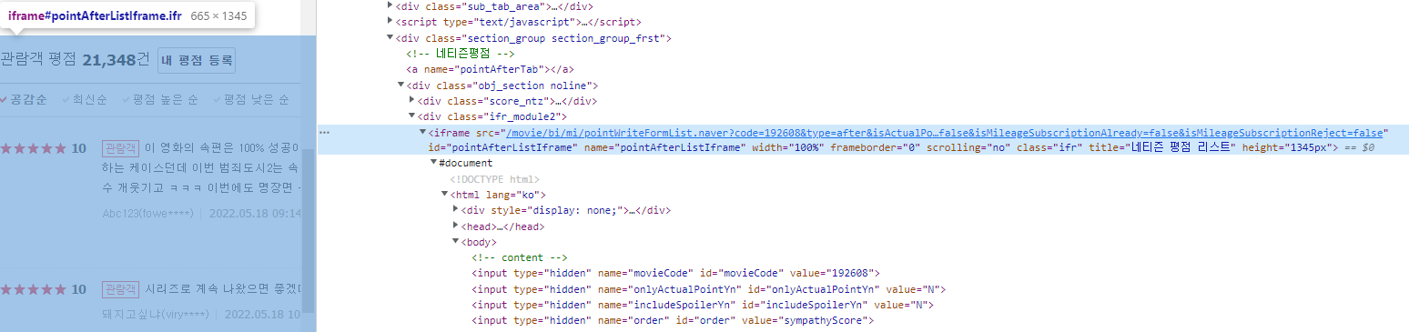 - 크롬 개발자 도구를 이용해서 <iframe>에 걸려있는 URL로 넘어가니 관람객 리뷰만 있는 페이지로 이동
