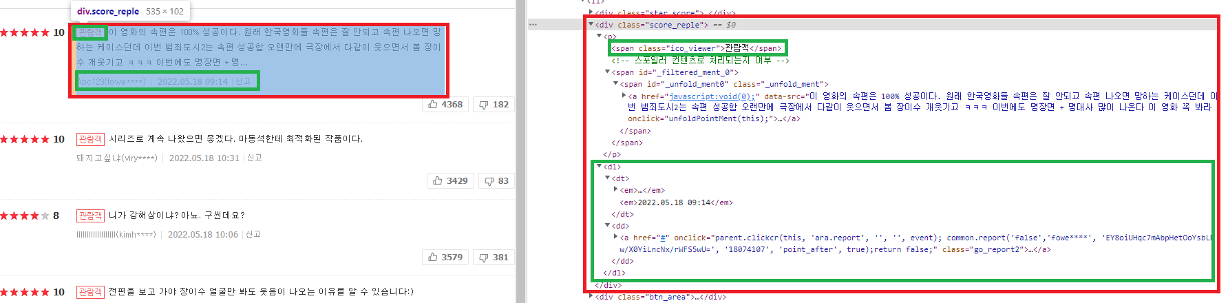 - 또는 <div class="score_reple"> 의 내용을 가져온 뒤,