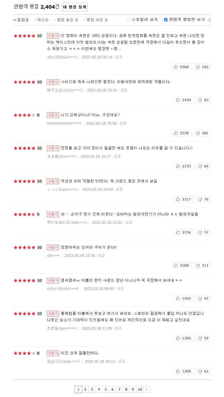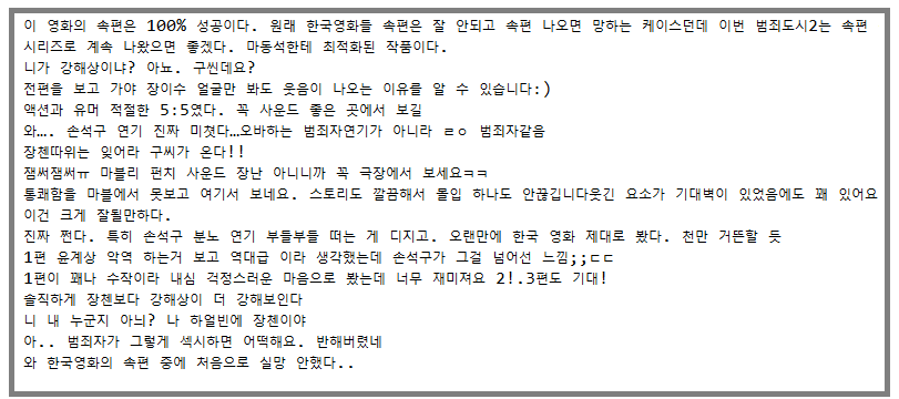 - "범죄도시2" 영화 평점을 관람객만 크롤링한 후 메모장 파일에 저장하기 (TheOutlaws2.txt)