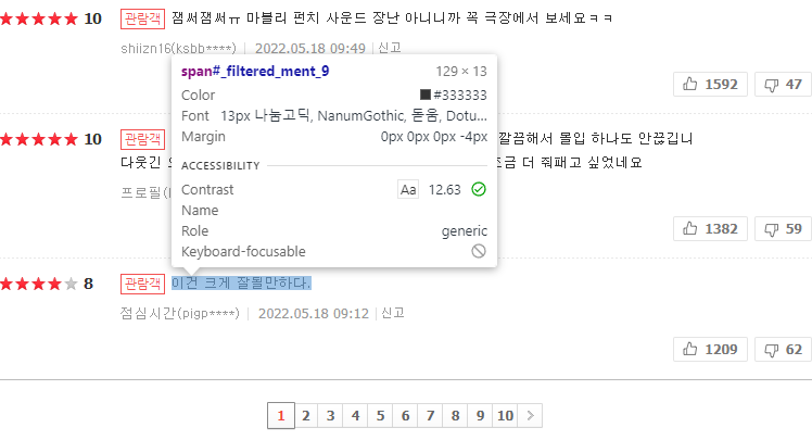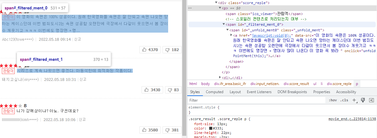 - 리뷰 내용이 들어있는 HTML요소 <span id="_filtered_ment_0"> ~ <span id="_filtered_ment_9">