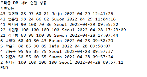 System.out.println(rs.getInt(3)); //3번 칼럼, kor칼럼