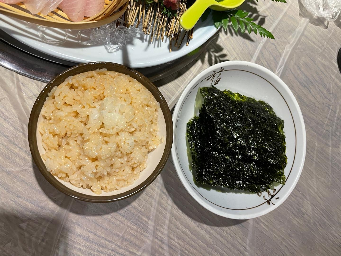 모듬숙성회에 기본으로 같이 제공하는 미역국과 초밥밥, 김