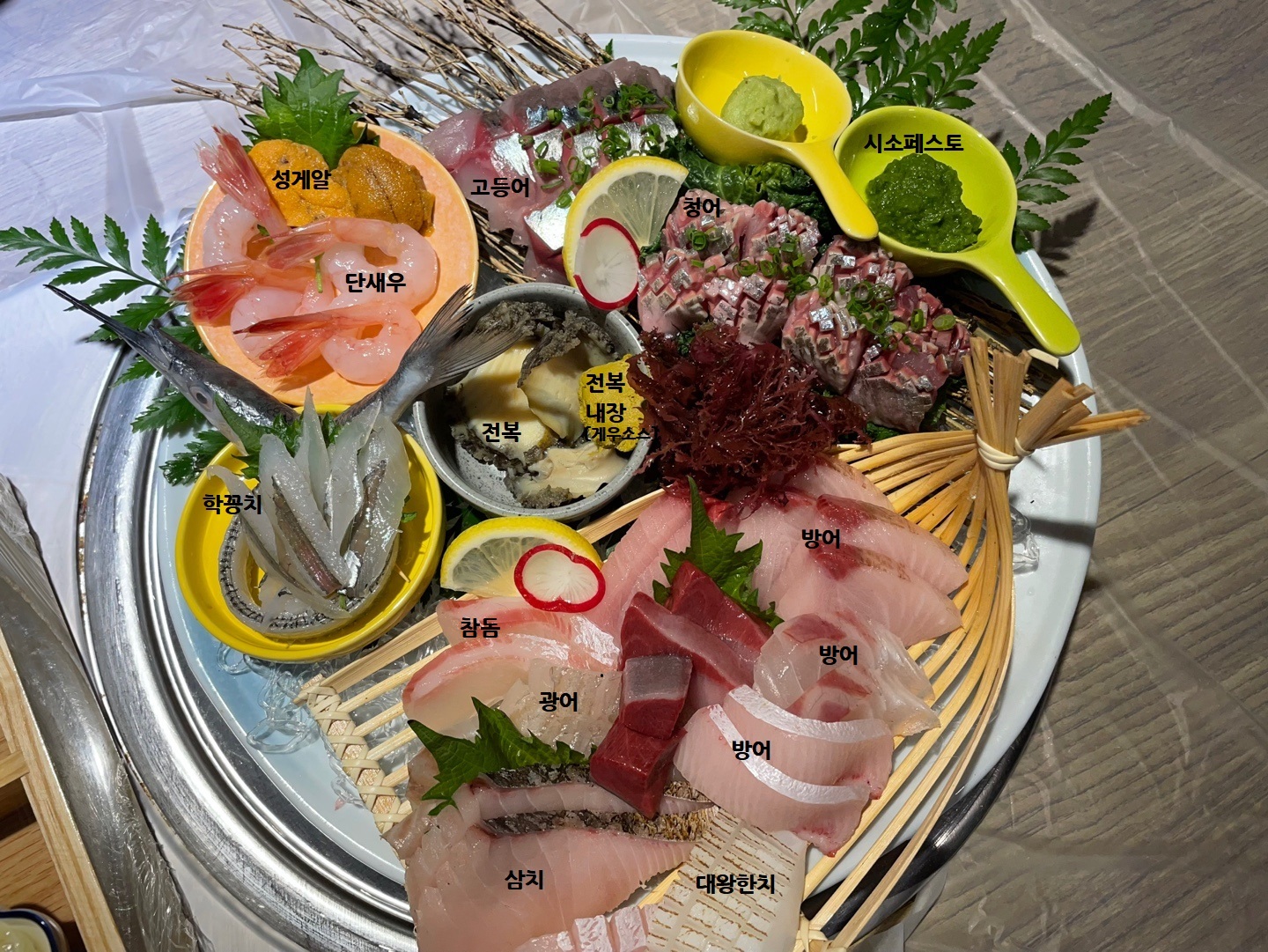 참돔, 고등어, 대광어, 대방어, 대삼치, 청어, 단새우, 우니(성게알), 전복, 대왕한치, 학꽁치