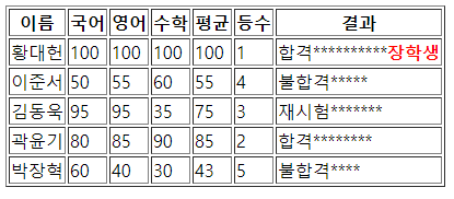 단, 국영수 세 과목 중에서 한 과목이라도 40점 미만이면 "재시험(과락)"
