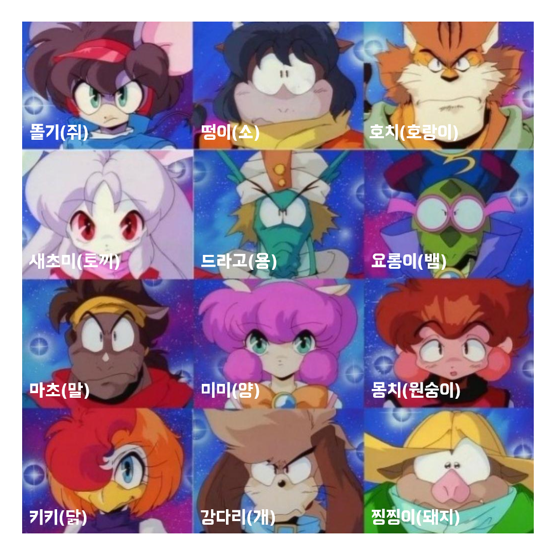 var animal=["원숭이", "닭", "개", "돼지", "쥐", "소", "호랑이", "토끼", "용", "뱀", "말", "양"];