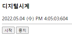 - 시작 버튼을 누르면 현재 날짜와 시간이 나오고, 중지 버튼을 누르면 멈춤