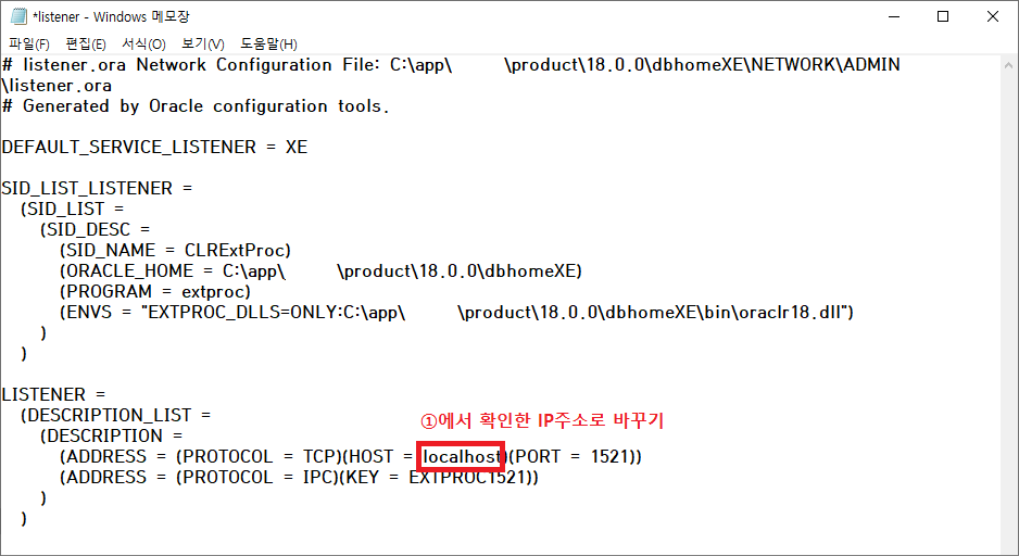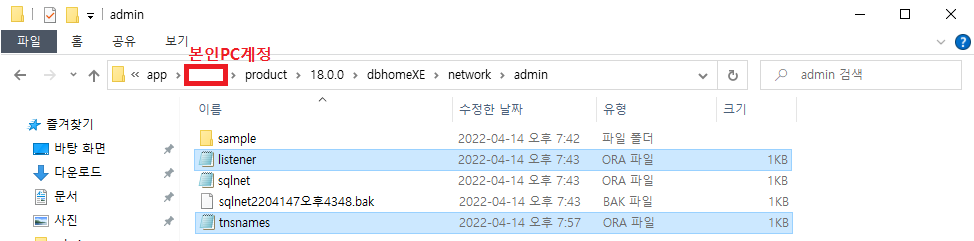 - 경로) C:\app\본인PC계정이름\product\18.0.0\dbhomeXE\network\admin
