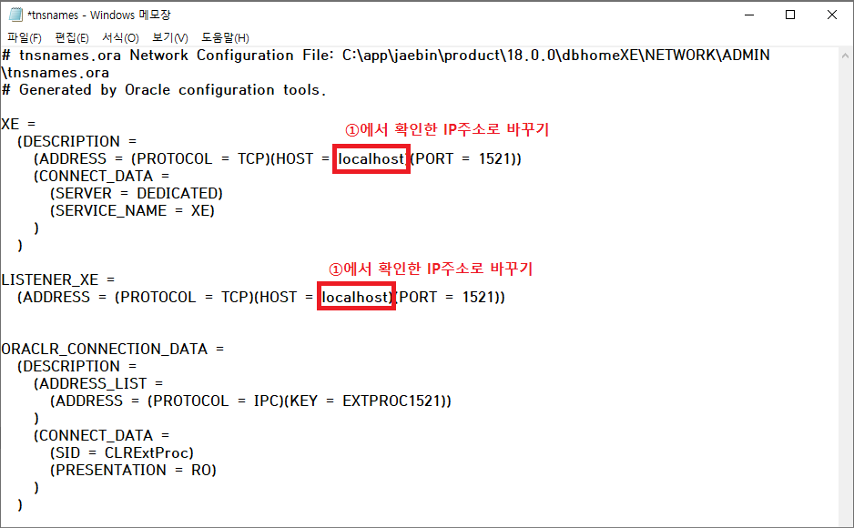 - 해당 경로에 있는 listener.ora와 tnsnames.ora 파일을 메모장으로 열어서