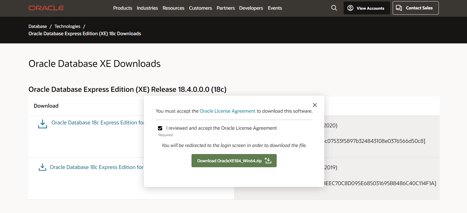 https://www.oracle.com/database/technologies/xe18c-downloads.html (18c 다운로드 링크)