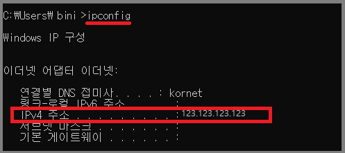 - 명령프롬프터 → "ipconfig" 입력 → IPv4 주소 확인하기