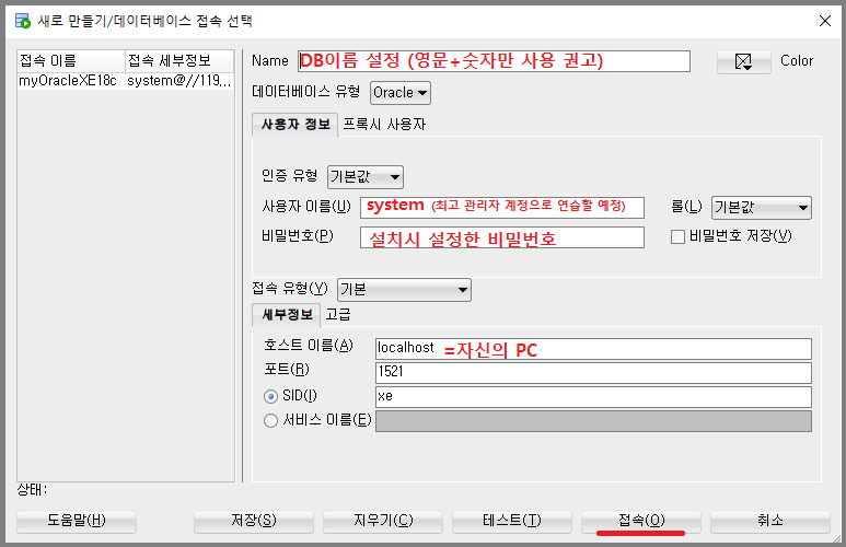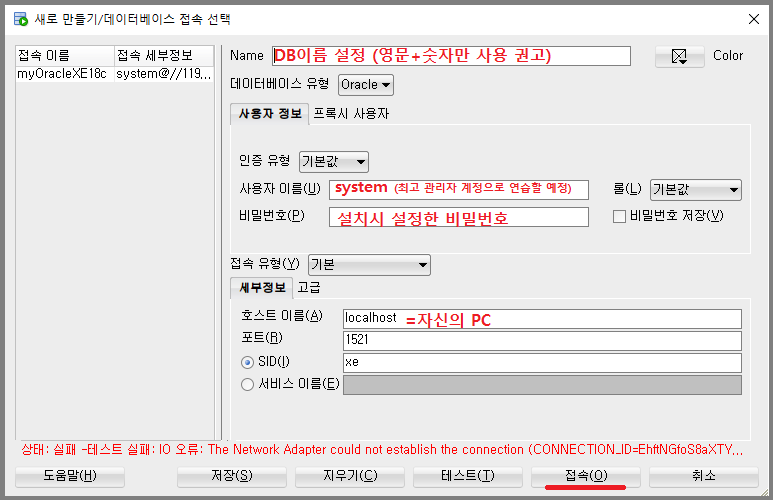 ③ 다시 Oracle Database 18c XE 접속 생성 시도