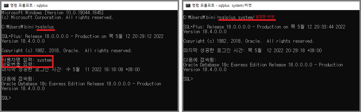 - 명령프롬프트에서 "sqlplus → 사용자명 → 비밀번호" 차례로 입력하는 것도 가능