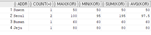 select addr, count(*), max(kor), min(kor), sum(kor), avg(kor)