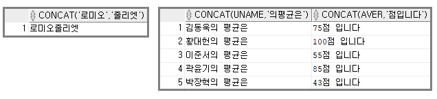 - 형식) concat(칼럼명, '문자열') / concat('문자열', '문자열')