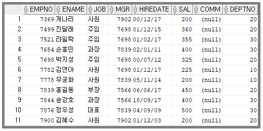 values(7369, '개나리', '사원', 7902, '2000-12-17', 200, 20);