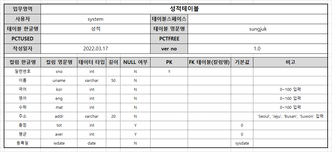 | 11. 학사관리 DB 모델링 연습 (정규화, 테이블 시나리오, 테이블 정의서) (0) | 2022.05.18 |