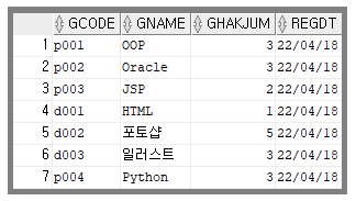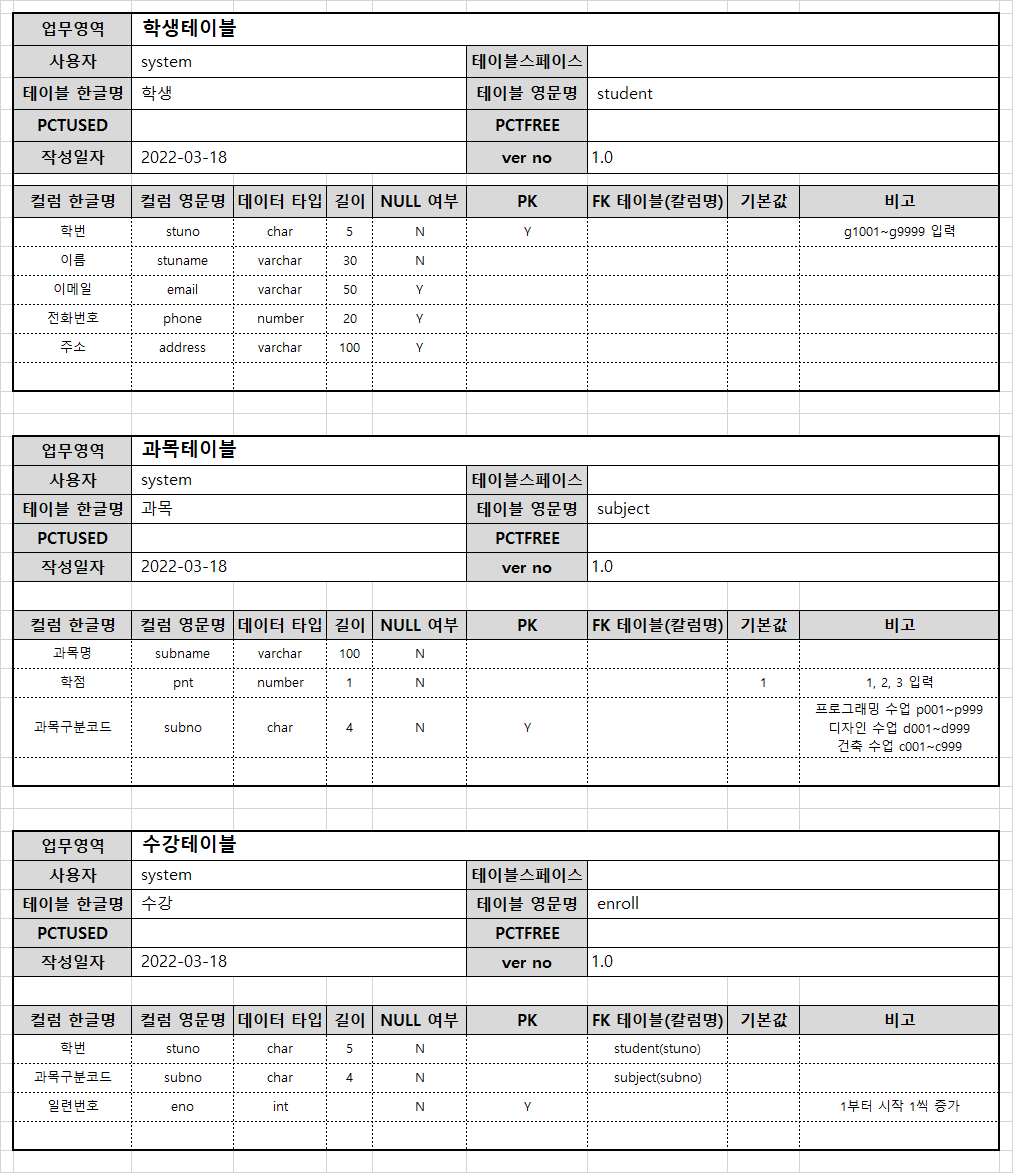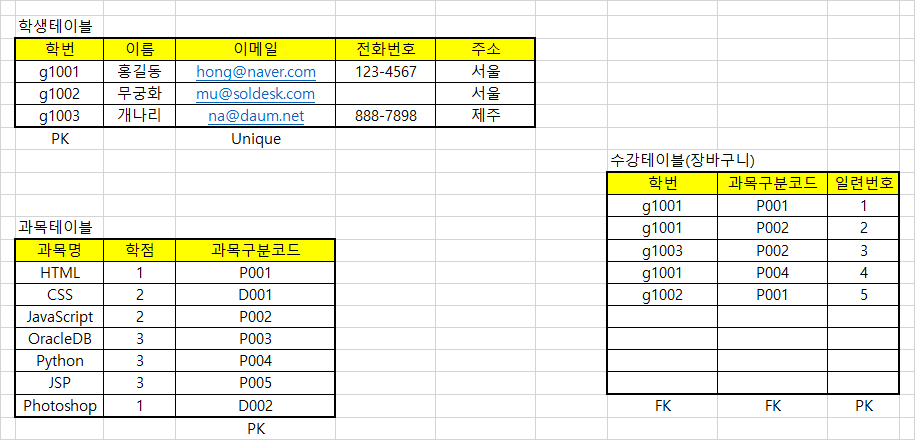 - 참조무결성 : 수강테이블의 학번과 과목코드는 반드시 학생테이블과 과목테이블에 존재해야 한다