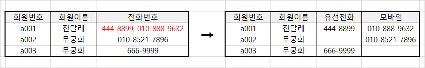 - 관계형 데이터베이스의 설계에서 중복을 최소화하게 데이터를 구조화하는 프로세스