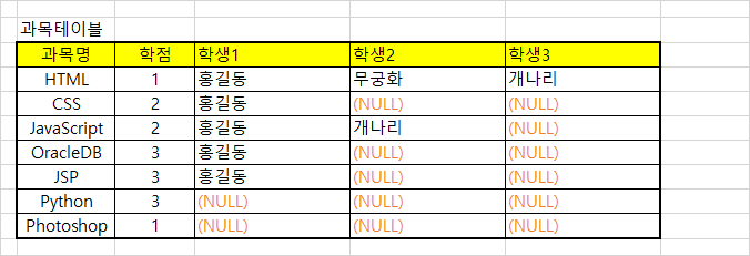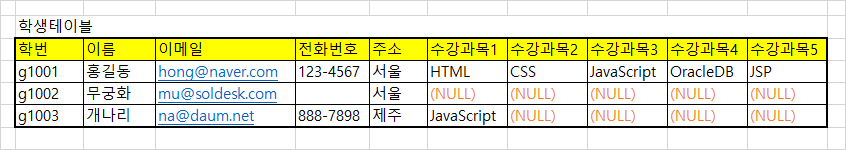 ① 학생테이블에서 홍길동의 수강신청과목이 추가될수록 칼럼이 계속 추가되는 현상이 보이고 있음