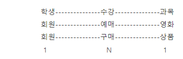 - 다:다 (N:N) → 반드시 교차테이블이 있어야 함