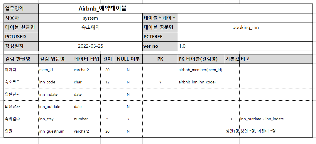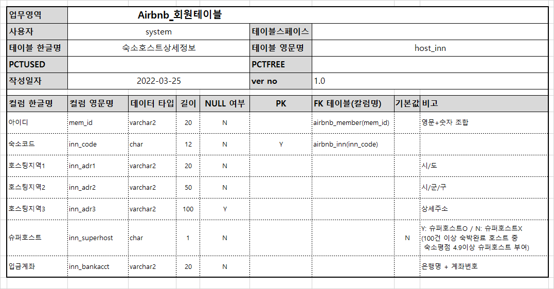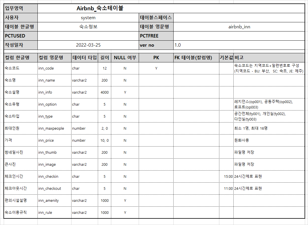 - 테이블 정의서 폼은 강사님이 수업시간에 예시로 보여주신 폼으로 통일