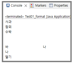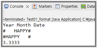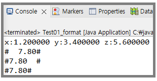 System.out.printf("%-6.2f", 7.8);//"7.80 " : 6칸을 주고 7.8을 쓰는데, 소수점 2자리로, 뒤 빈칸은 공백