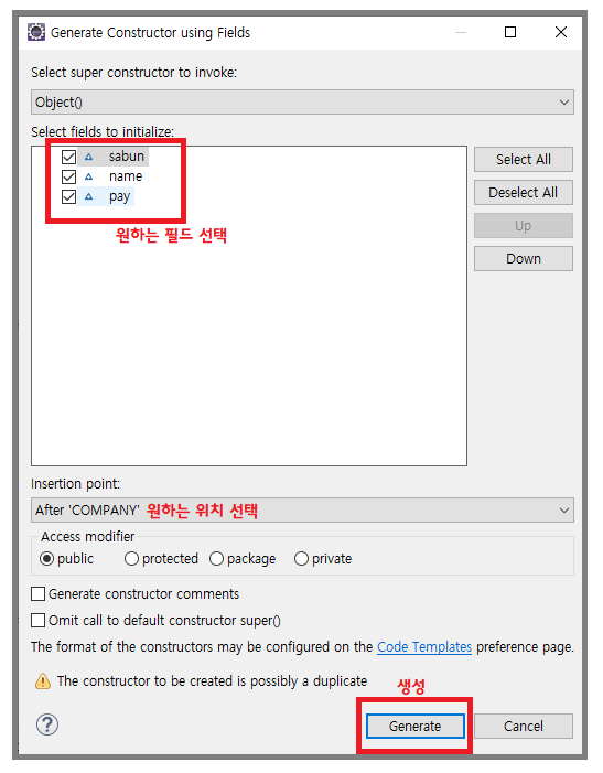 단, 생성자 함수를 오버로딩하면 기본생성자 함수가 자동 생성되지 않기 때문에 수동으로 생성할 것을 추천!!