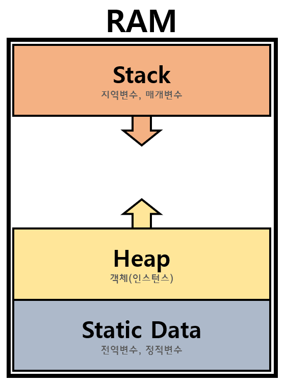- RAM 메모리 공간은 static, heap, stack으로 구분됨