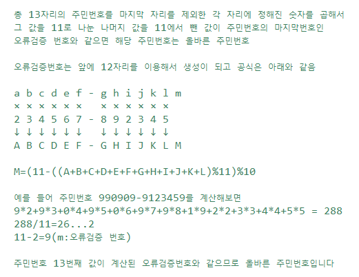 int M=(11-((A+B+C+D+E+F+G+H+I+J+K+L)%11))%10; //유효성 검사식