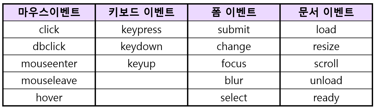 - 그 외 jQuery에서 가능한 이벤트 참고 : W3Schools